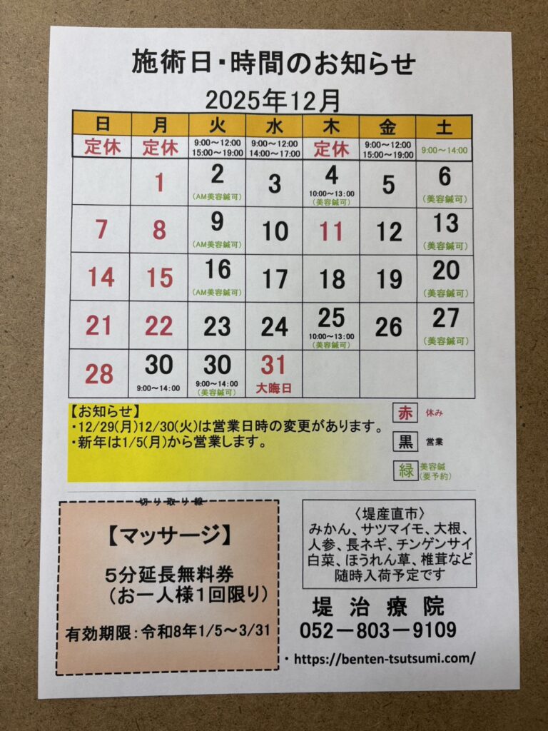 《12月の日程》堤治療院の施術日・時間のお知らせ