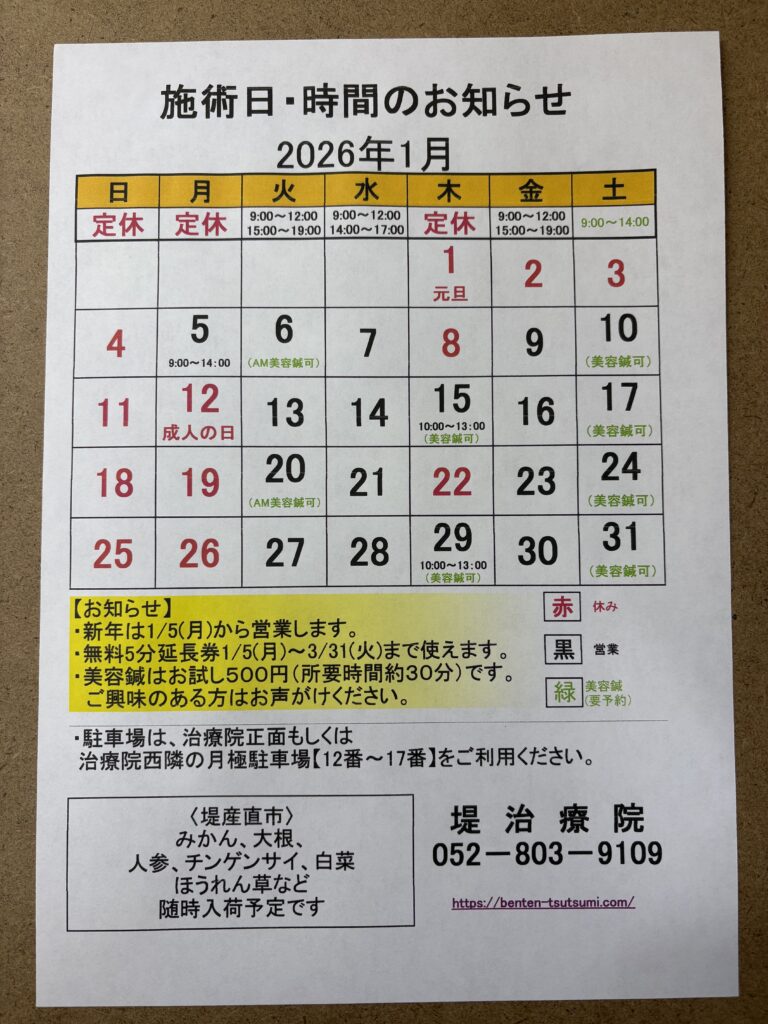 《1月の日程》堤治療院の施術日・時間のお知らせ