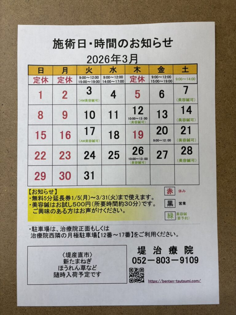 《3月の日程》堤治療院の施術日・時間のお知らせ